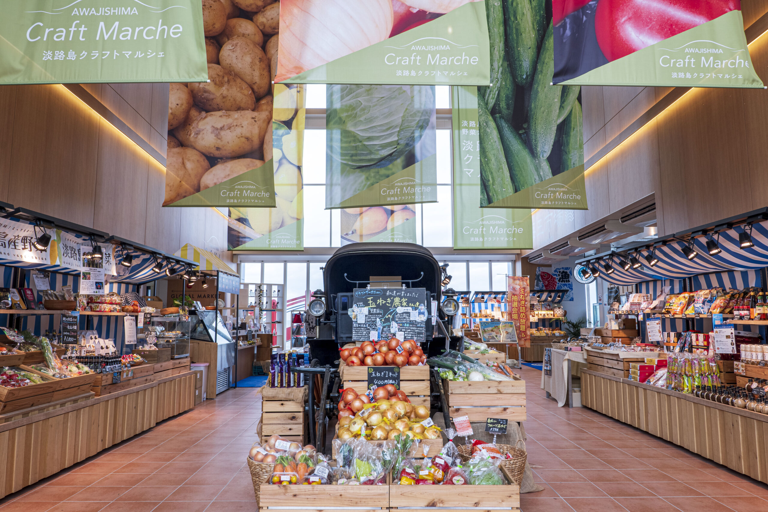 地元農家から仕入れた朝採れ野菜、淡路島の特産品やオリジナルジェラート、パソナハートフルの焼き菓子やナチュラルフーズなど、約200種類の商品を販売するマーケット。