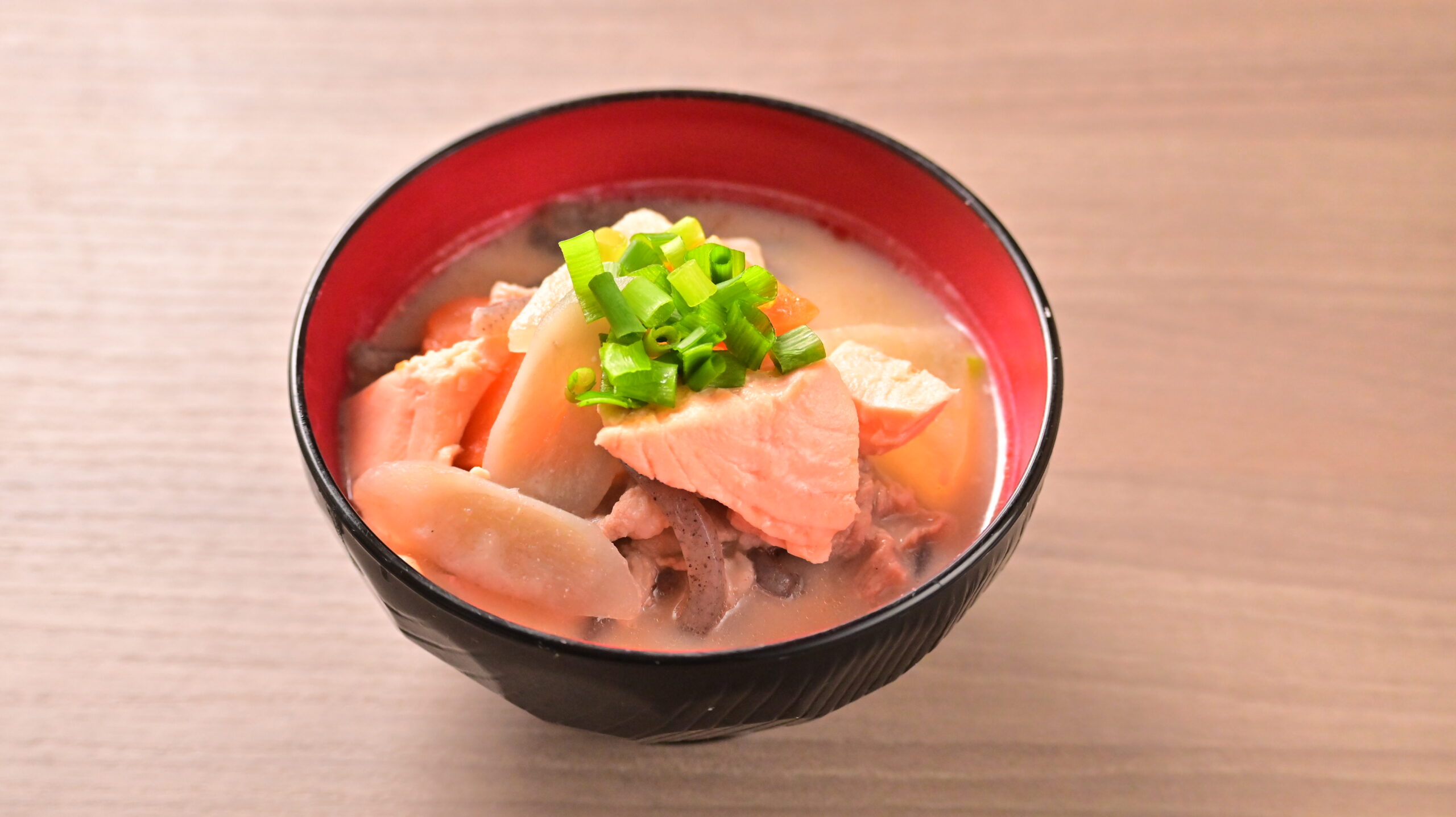 粕汁です。優しく食べやすい味わいに仕上がっております。寒い季節にピッタリで体の芯からぽかぽか温まります。この機会に是非ご賞味ください。