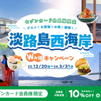 クラフトサーカス【セゾンカード会員限定の大特典旅!】淡路島西海岸 Wお得キャンペーン✨「クラフトサーカス」をはじめ淡路島西海岸施設では、セゾンカード会員様限定で、淡路島の美しいオーシャンビューや…2025.12.24 -